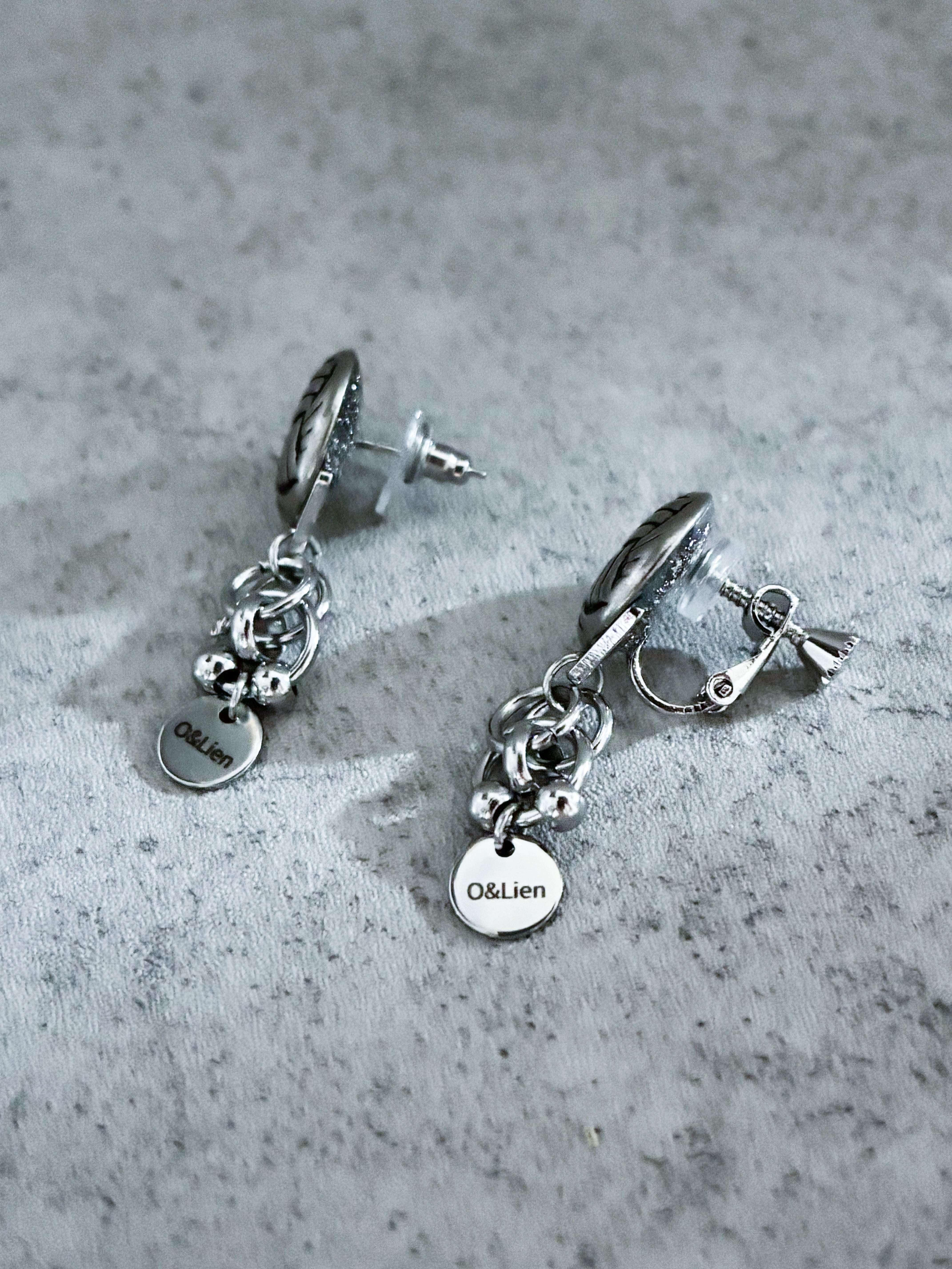 シルバーのヴィンテージボタンとチェーンパーツを合わせたクールなピアス/イヤリング。