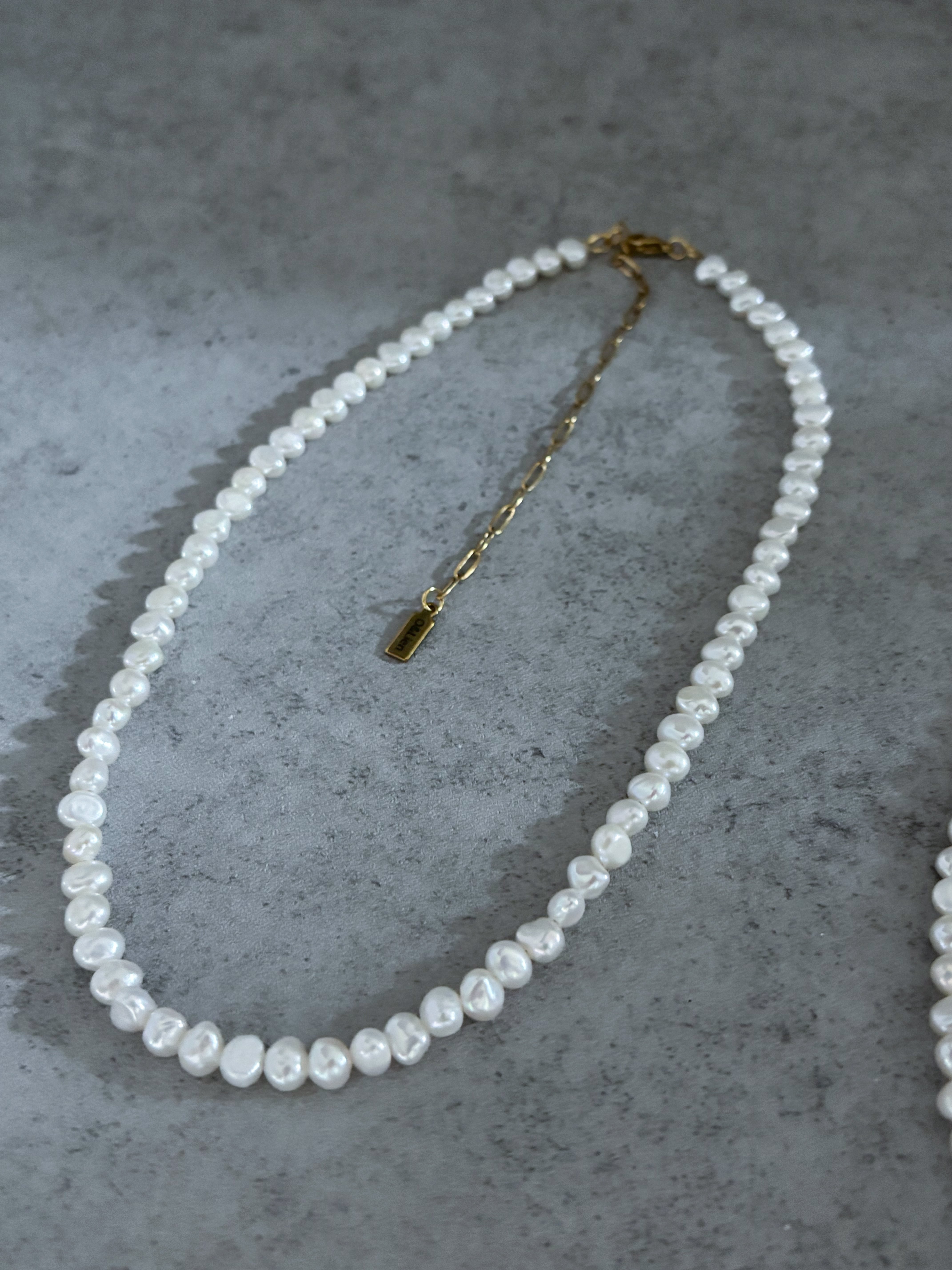ちょっといびつなバロックタイプの淡水パールのネックレス。